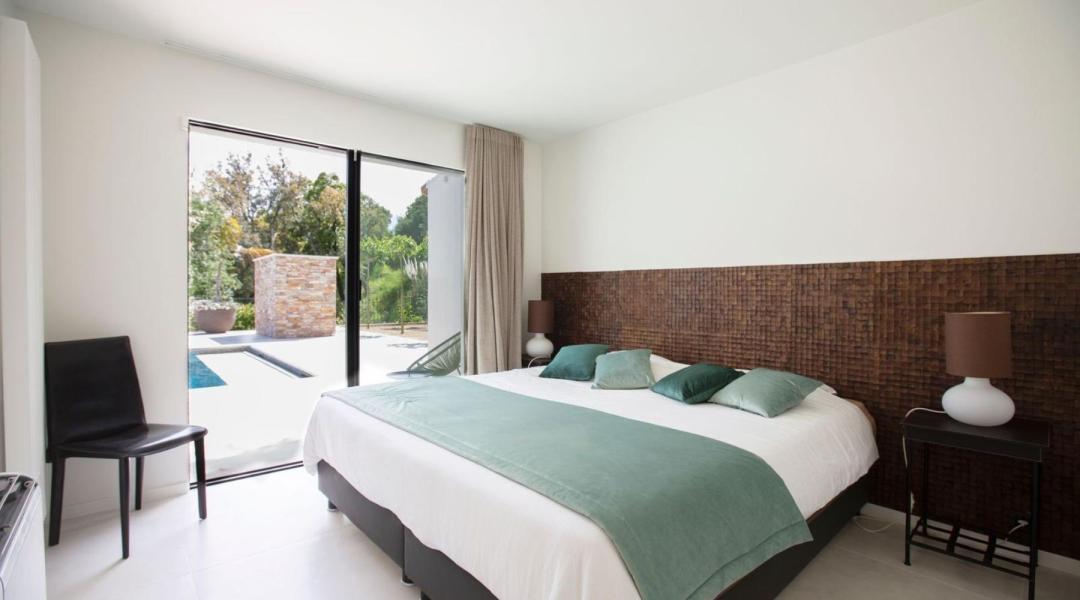 Er zijn 6 slaapkamers, elk met een eigen badkamer met douche en/of bad. 4 slaapkamers met een tweepersoonsbed (180x200m), 1 slaapkamer met een tweepersoonsbed (200x200m), 1 slaapkamer met twee eenpersoonsbedden (90x200m). Op het woon- of zwembadniveau zijn er 3 vergelijkbare tweepersoonsslaapkamers en de kamer met de eenpersoonsbedden. Deze is verbonden door een (afsluitbare) deur met een van de tweepersoonskamers dus ideaal voor gezinnen. Op de bovenverdieping zijn er nog twee iets grotere tweepersoonskamers. Een van deze kamers heeft een eigen terras.