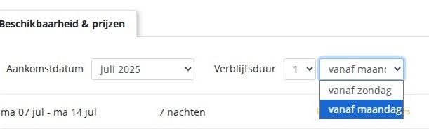 Klik in de kalender op de gewenste startdatum van uw vakantie en kies rechts het aantal vakantie weken. U ziet dan rechtsonder de huurprijs van deze villa voor de door u gewenste weken.