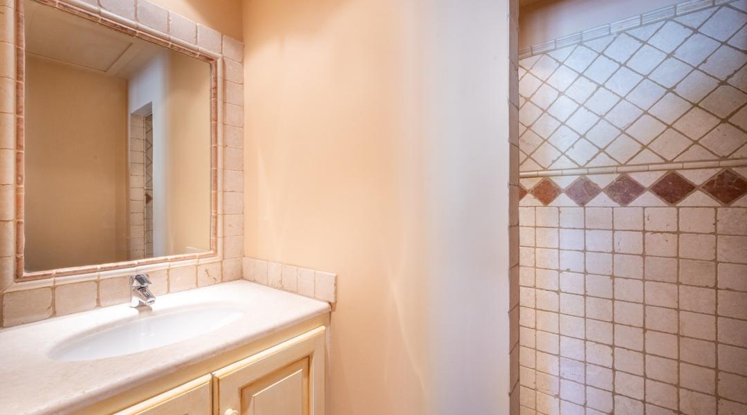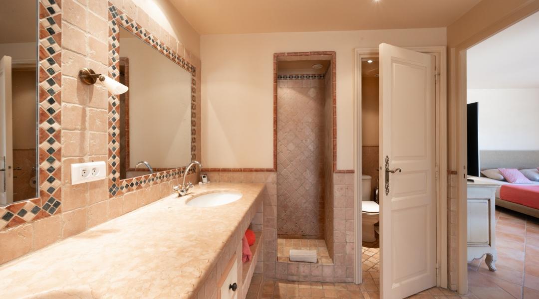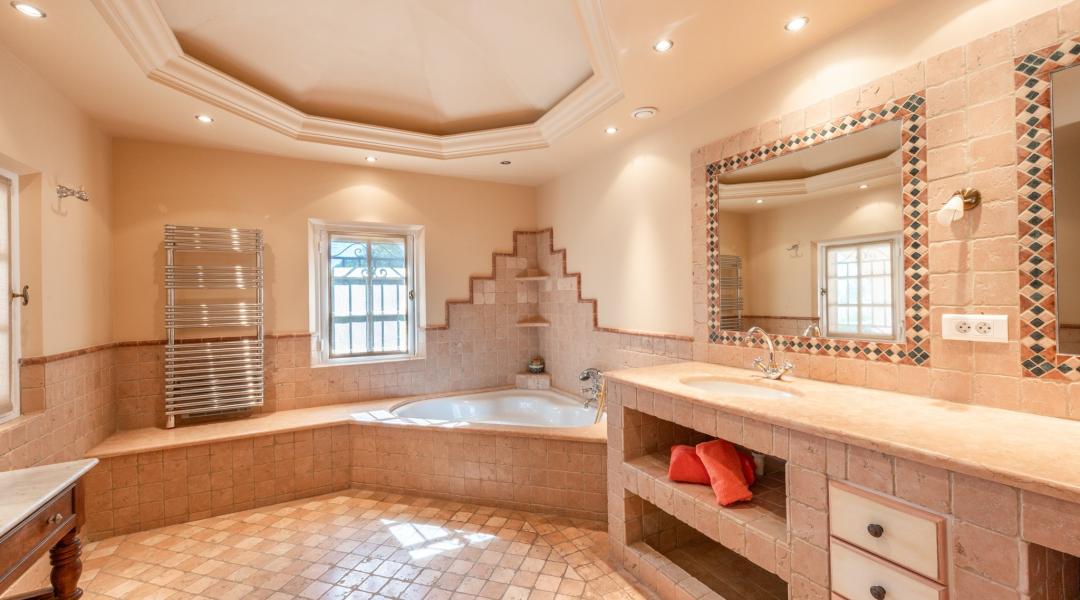Badkamer bij masterbedroom met douche, bad, dubbele wastafel en toilet 2 badkamers met douche en wastafel 1 badkamer met bad en dubbele wastafel2 aparte toiletten